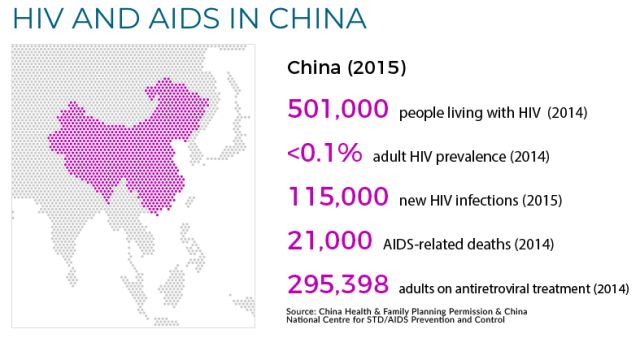 在中国,仅在2014年,就有21,000人死于与艾滋病有关的原因。尽管做出了这些努力,但在2016年12月,中国疾病预防控制中心(CCDC)在该年的前九个月报告了96,000个新的HIV病例。这意味着2016年新病例数量可能会超过2015年的115,000人。